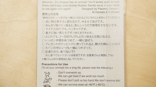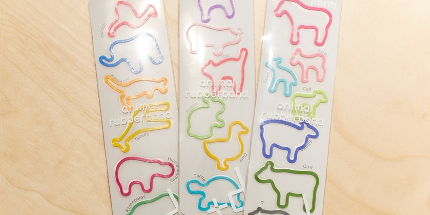 初の商品はパスキーデザインによるウマやヒツジなど可愛らしい動物のカタチをカラフルな輪ゴム、「アニマルラバーバンド」である。