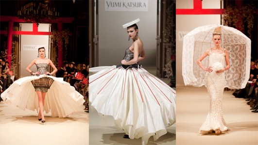 ファッションデザイナーYumi Katsuraブランドとのコラボレーション。和傘のテクニックを駆使したアンブレラスカート(左)と和紙レースによるアンブレラベール(右)[両方ともデザイン/桂由美](2011年YumiKatsura春夏パリオートクチュールコレクションより)